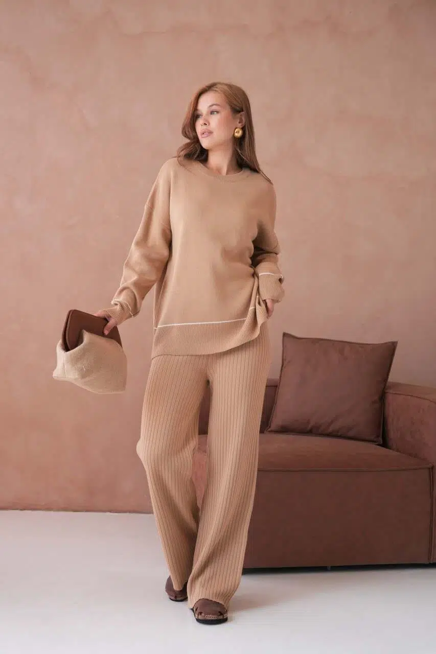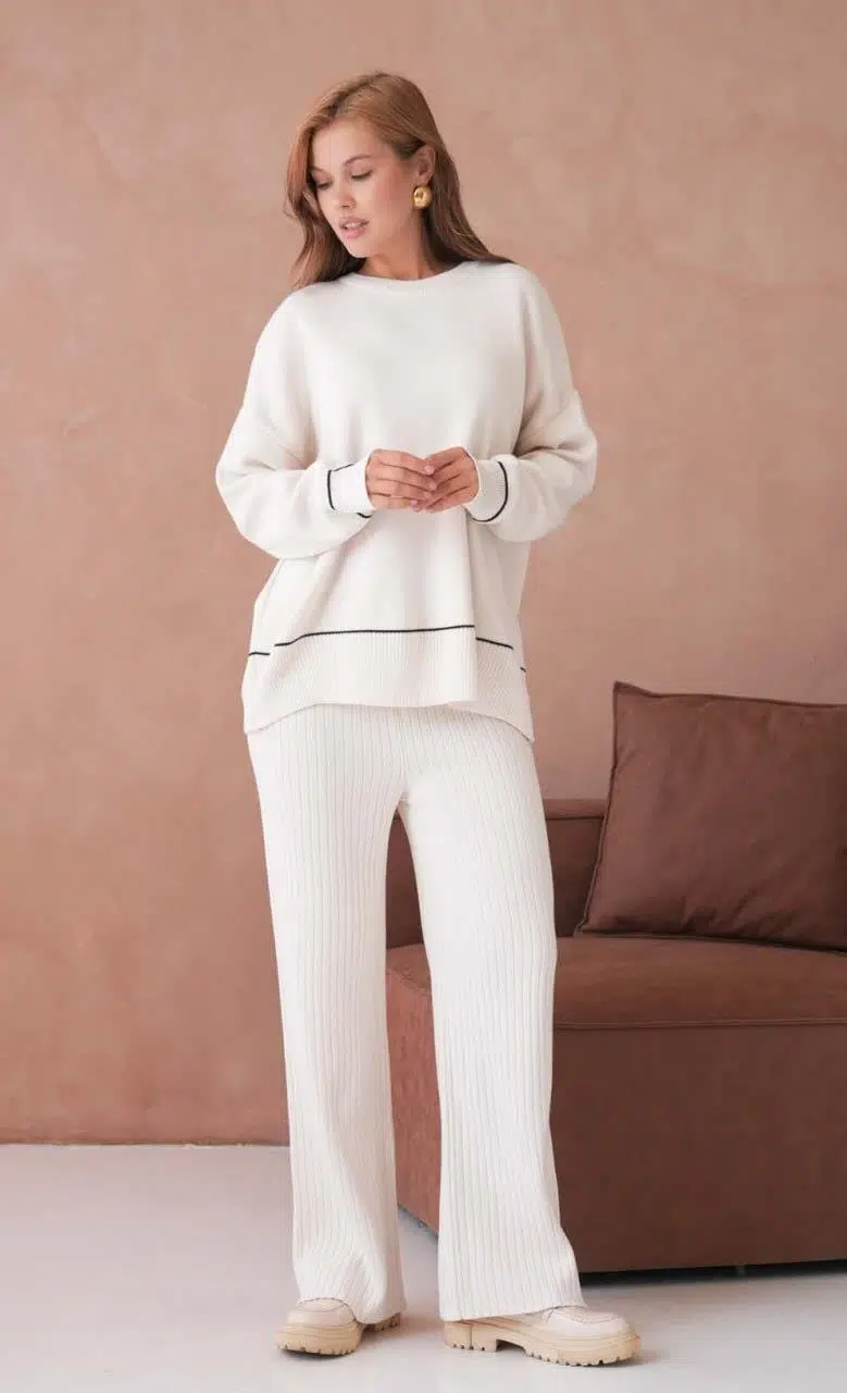 Sfır Yaka Çizgi Uç Triko Pantolonlu Takım