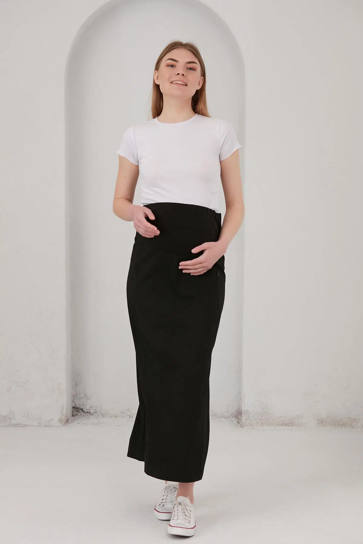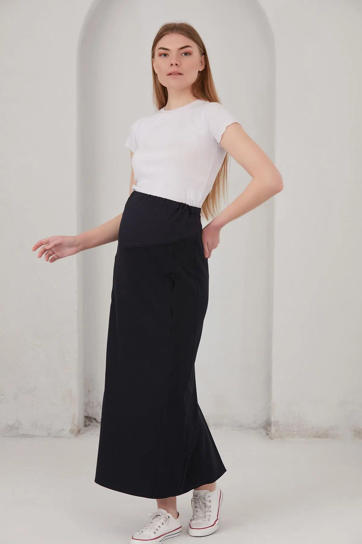 hamile giyim fermuar cepli etek, kapalı yırtmaç cep ağızlarındaki fermuar ile tamamlanarak spor bir görünüm almıştır, anne adaylarının hamilelik süresince ve sonrasında da severek kullanacağı bir model