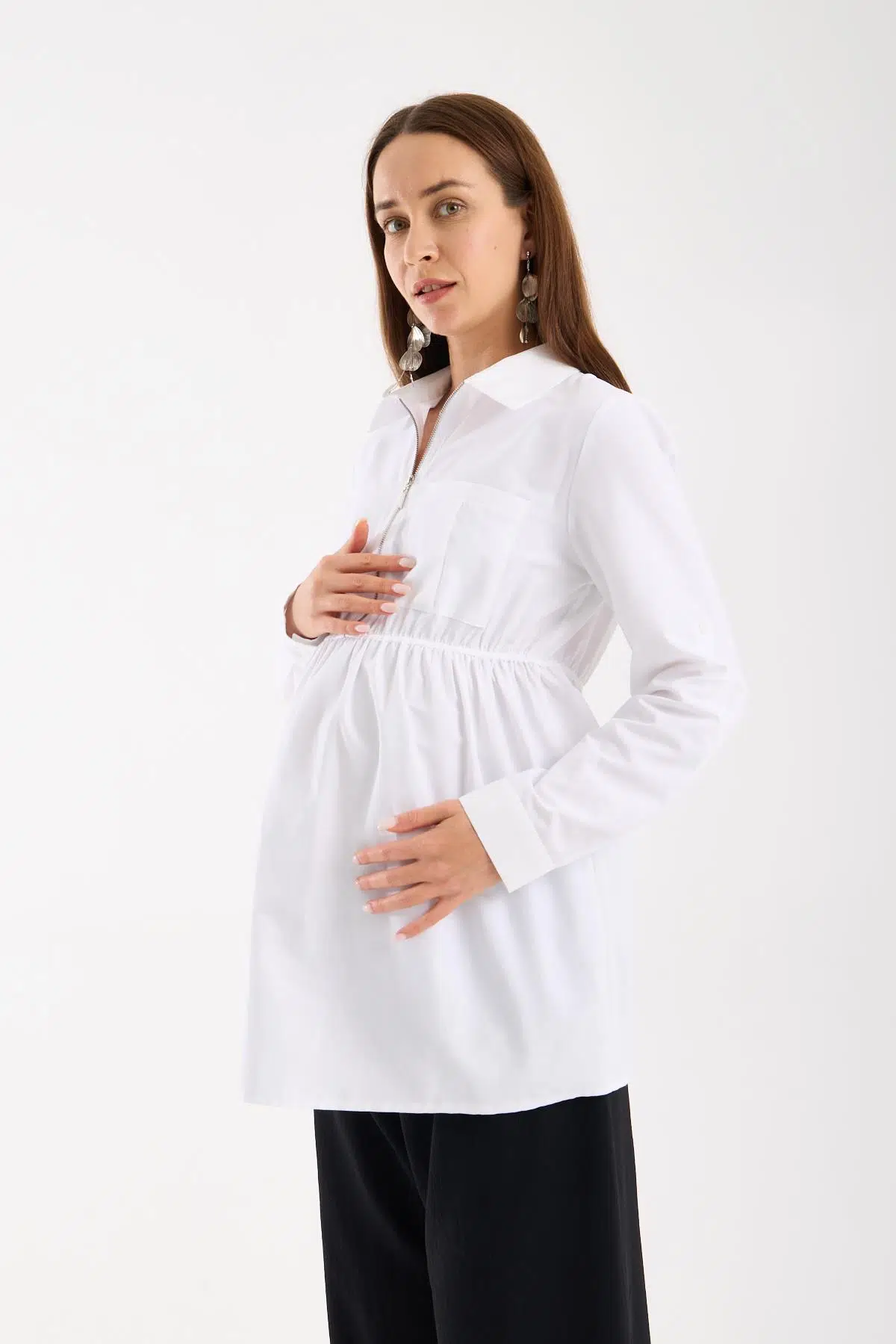 yumuşak dokulu pamuk kumaş fermuarlı yaka modeli ile spor bir görünüm alan gömlek modelin, hamilelik süresince ve sonrasında da kullanabilirsiniz. Emzirme kolaylığı sağlayan model aynı zamanda katlanabilir kollu olarak tasarlandı, ofis şıklığının vazgeçilmez rengi beyaz renk seçilmiştir.