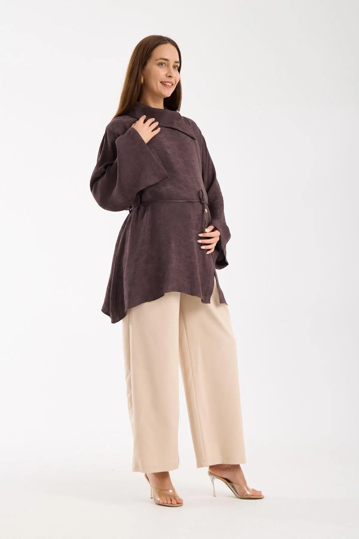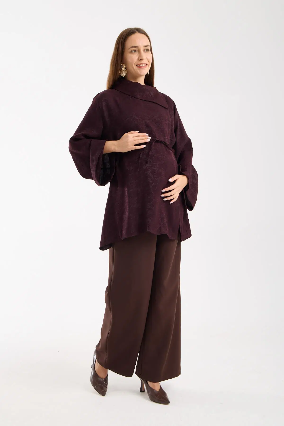 yumuşak dokulu simli jakar kumaş, katlı degaje yaka modeli çoban düğme ile tamalanarak zarfi bir görünüm verildi, aynı zaman gizli açılabilir düğmeler ile tamamlandı. Hamilelik süresince ve sonrasında da kullanıma uygun olan model emzirme kolaylığı sağlıyor