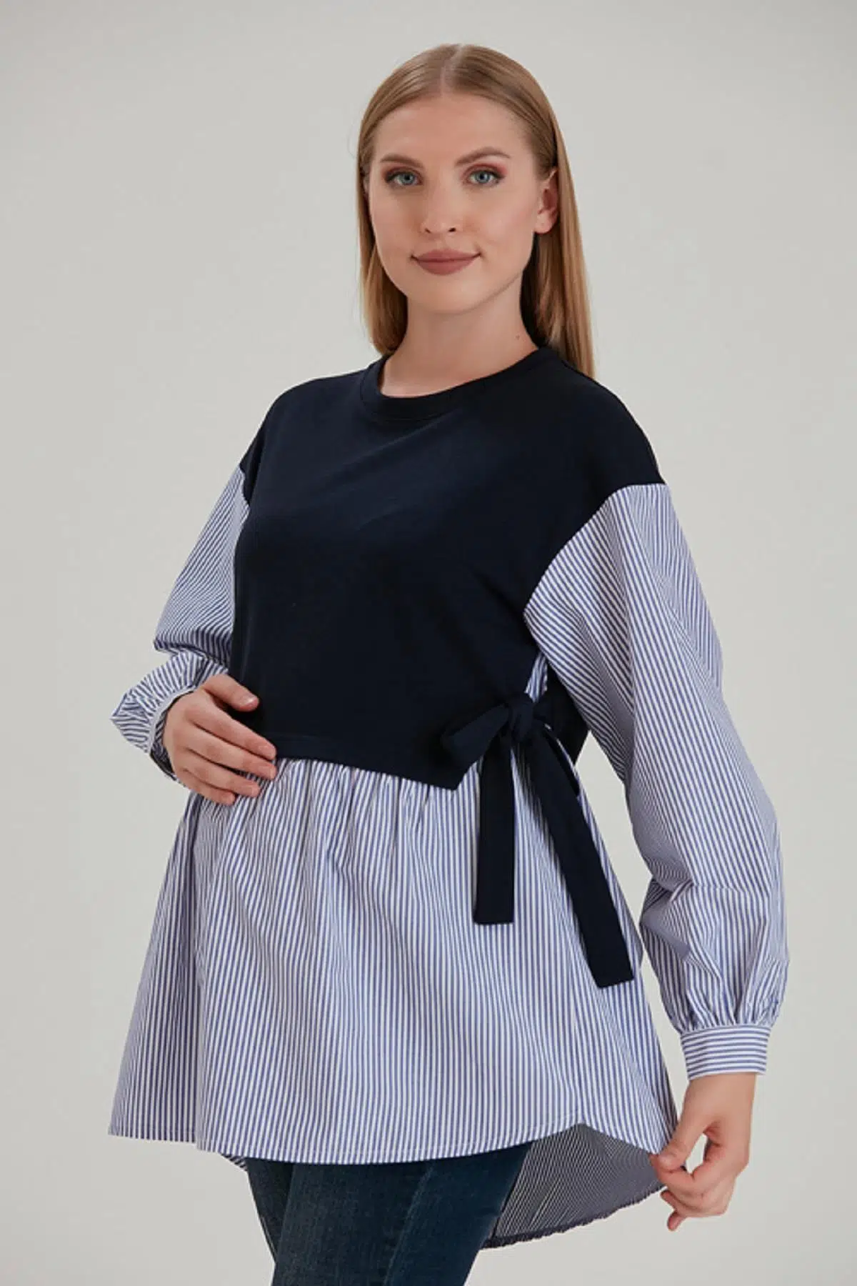 Çizgili Kombin Penye Yan Bağlamalı Hamile Gömlek-Bluz