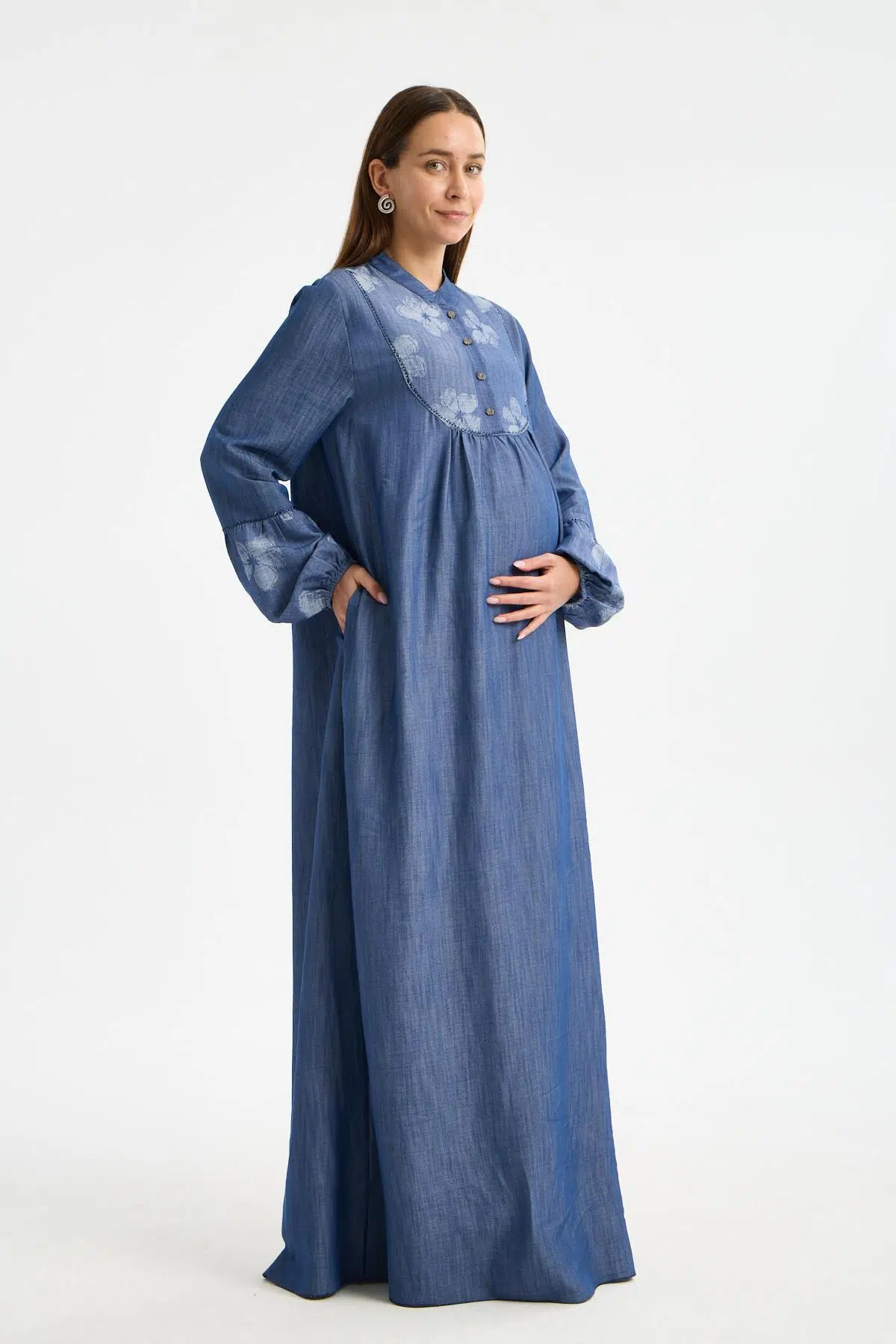 Boncuk İşlemeli Liyosel Kumaş Hamile Maxi Elbise