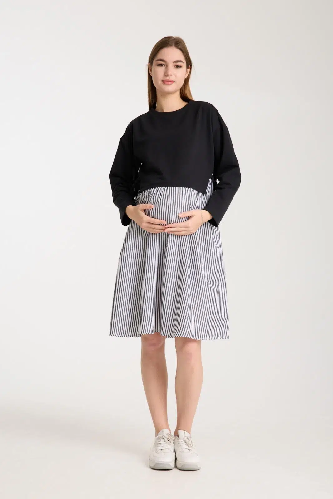 Yumuşak penye kumaş, çizgili pamuk kumaş ile kombinlenerek spor bir görünüm aldı. Hamilelik süresince ve sonrasında da kullanıma uygundur. Giyim tarzınıza göre kombinleyebilirsiniz..